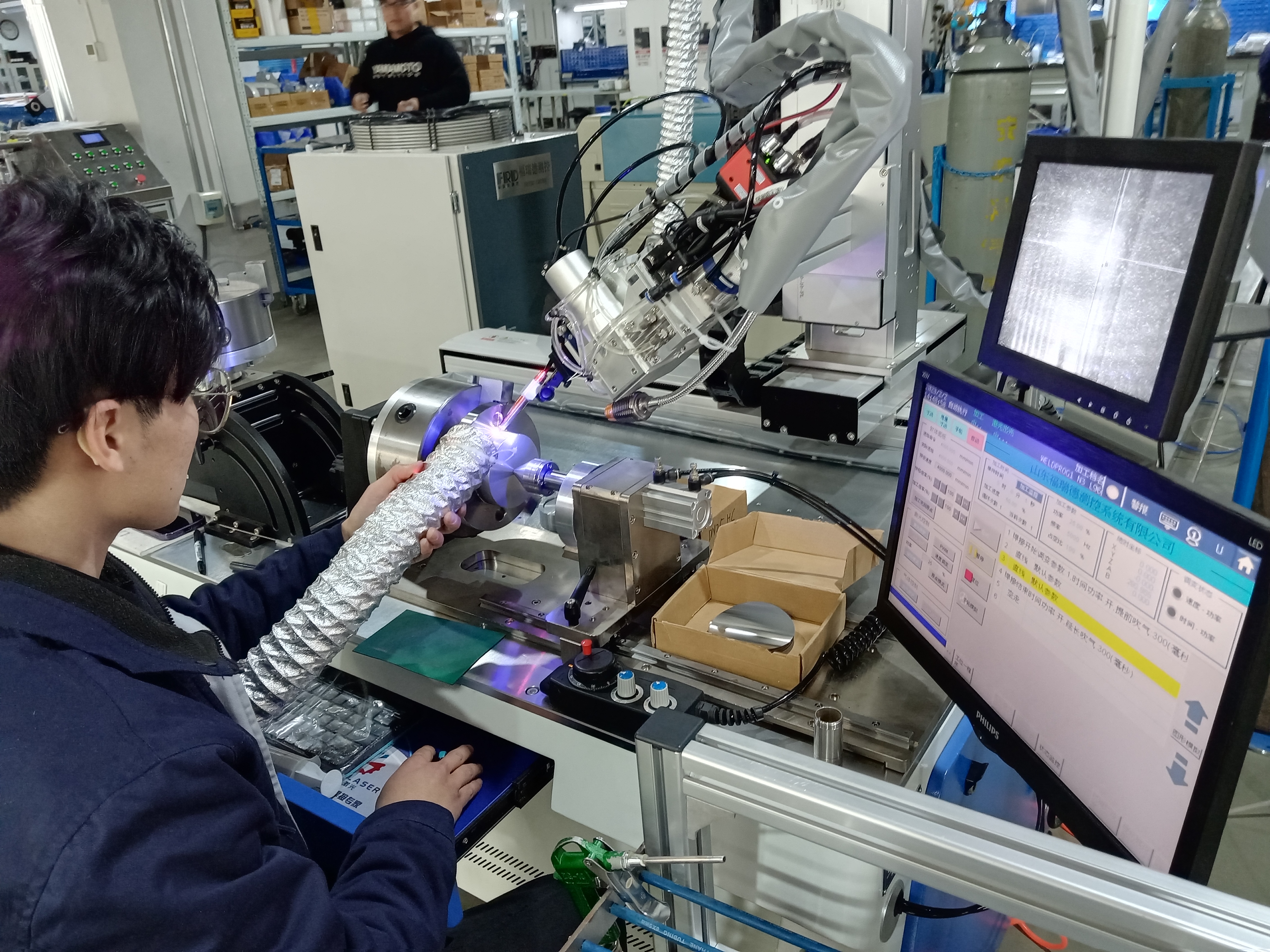福瑞德生产车间里,工人正在用激光焊接机对法兰膜头进行焊接,铆足干劲忙生产、赶订单