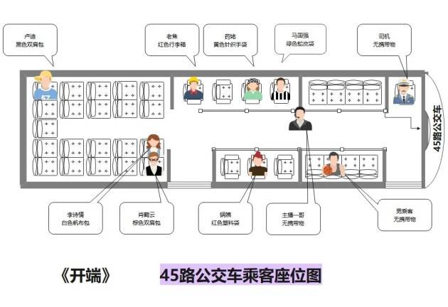 为了能给我们更好展现事端产生现场,小M用亿图图示给我们做了一张《45路公交车乘客座位图》。